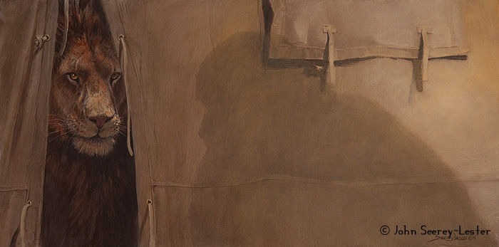 as the night was warm. A man lay injured on a cot, and a lion,