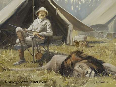 his lap, has probably changed into clean safari clothes to have
